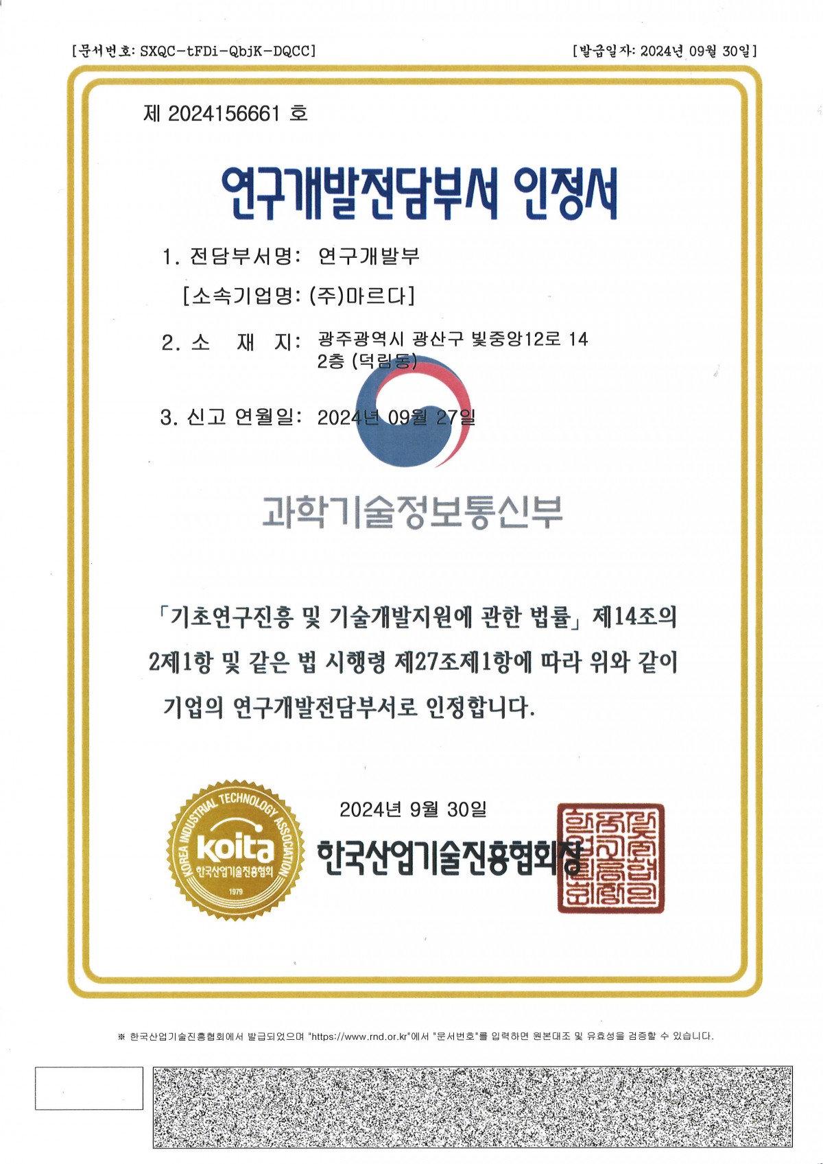 연구개발전담부서 인정서
