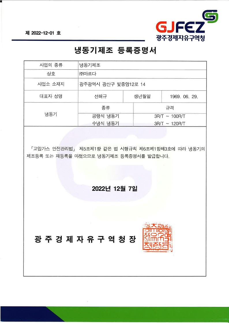 냉동기제조 등록증명서