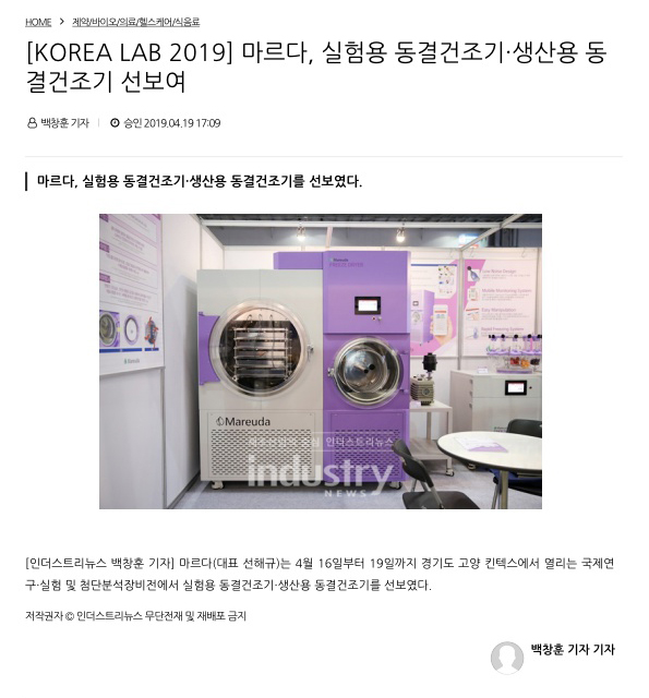 인더스트리뉴스// [KOREA LAB 2019] 마르다, 실험용 동결건조기·생산용 동결건조기 선보여_190419
